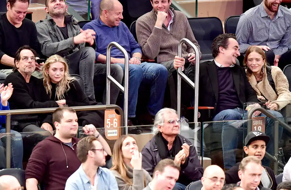 The group started off the night inside a suite at Madison Square Garden for the New York Knicks vs. Brooklyn Nets game, where Ashley showed some PDA with her financier boyfriend. The new couple kissed and looked cozy during the game, and the Elizabeth and James designer, 30, smiled as Sachs, 58, gave her a smooch on the cheek. They sat across the aisle from Mary-Kate and Sarkozy, 47, who snuggled and showed some affection of their own.