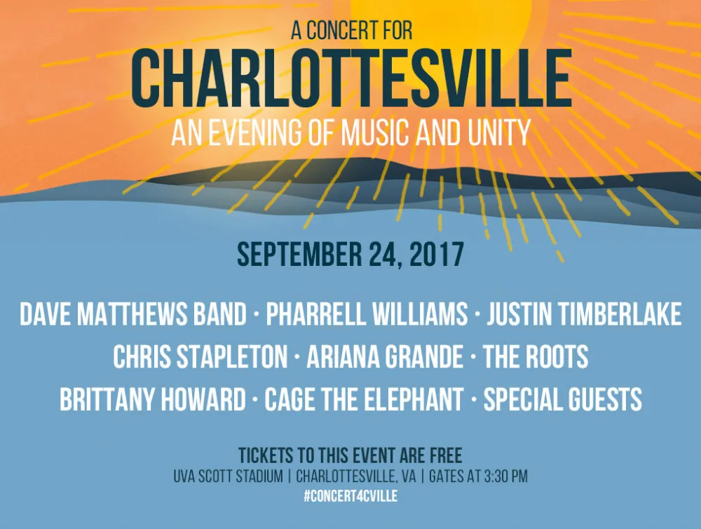 “A Concert for Charlottesville” will take place on Saturday, September 24 at the University of Virgina’s Scott stadium, and feature performances by Dave Matthews Band, Justin Timberlake, Ariana Grande, Pharrell Williams, The Roots, Chris Stapleton, Cage the Elephant and more. Doors open at 3:30 p.m.