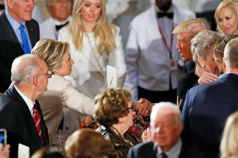 After the president, 70, took his oath of office and delivered his first official speech outside the Capitol building, Trump made his way inside for the Statuary Hall luncheon hosted by Congress. In the rotunda, he greeted the 42nd President of the United States, Bill Clinton. Trump then hugged another woman before Hillary, 69, came forward to shake hands with her former rival.