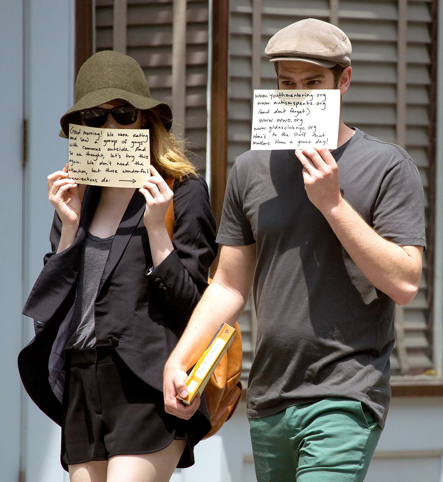 This isn't the first time that the lovers have outsmarted paparazzi with charitable actions. In September 2012, Stone, 25, and Garfield did the same thing, once again in New York City. That day, their signs read, "We just found out that there are paparazzi outside the restaurant we were eating in. Why not take this opportunity to bring attention to organizations that need and deserve it? www.wwo.org, www.gildasclubnyc.org. Have a good day!"