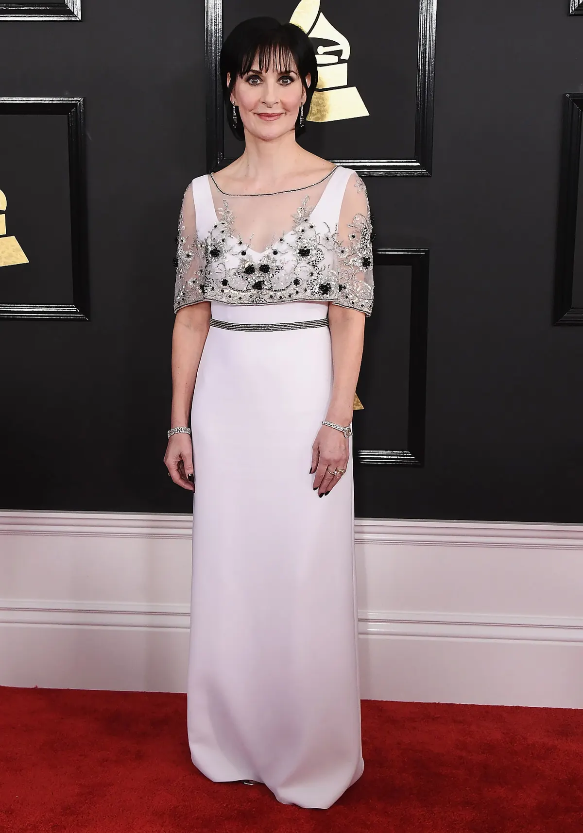 Amid her famed reclusiveness, Enya made a rare public appearance at the Grammy Awards back in February 2017, where she was nominated for Best New Age Album for her album Dark Sky Island. She maintained her signature black bob hairstyle while sporting a simple and chic white dress with a beaded mesh shoulder covering.