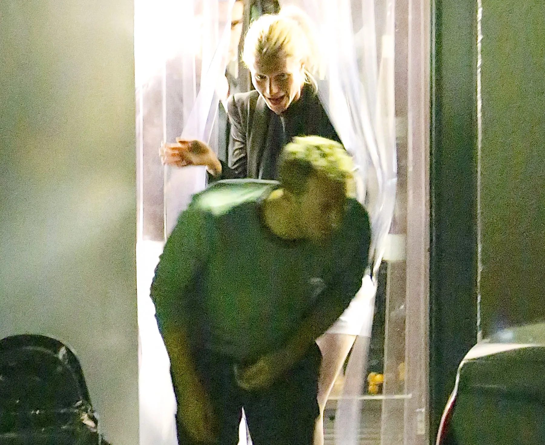 The parents to Apple, 9, and Moses, 7, were spotted sharing dinner at Italian restaurant Giorgio Baldi. They slipped out through plastic curtains in a back exit from the establishment in an attempt to go unnoticed.
