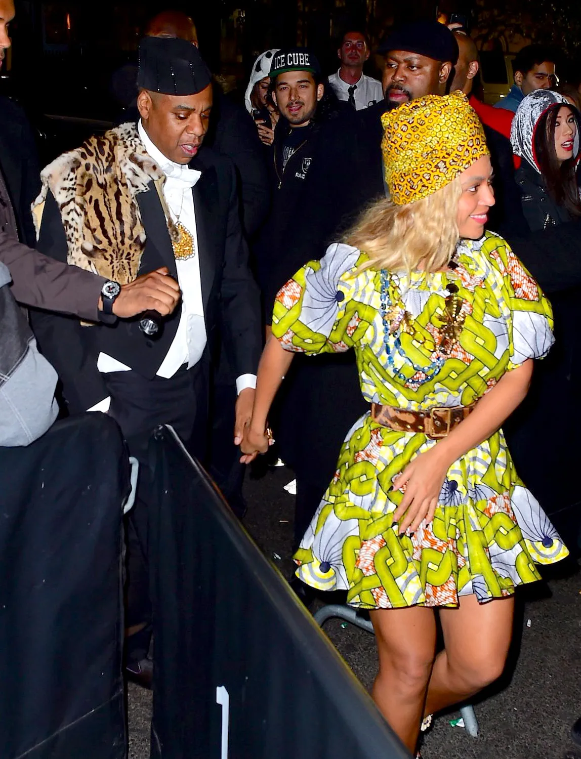 Beyonce, meanwhile, donned a green-and-white patterned mini-dress, royal purple turban, leopard-print belt and stilettos — and didn’t skimp on the jewelry.