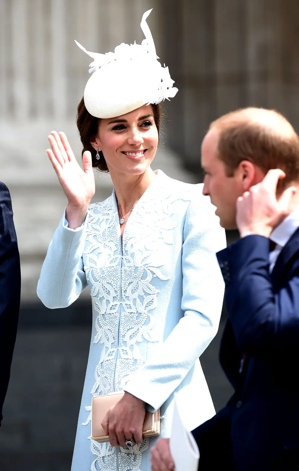 Looking stunning in a pale blue Catherine Walker creation, Kate Middleton wore her hair up in a loose ponytail, sporting a white pillbox hat by milliner Jane Taylor to top off her pretty, formal attire.