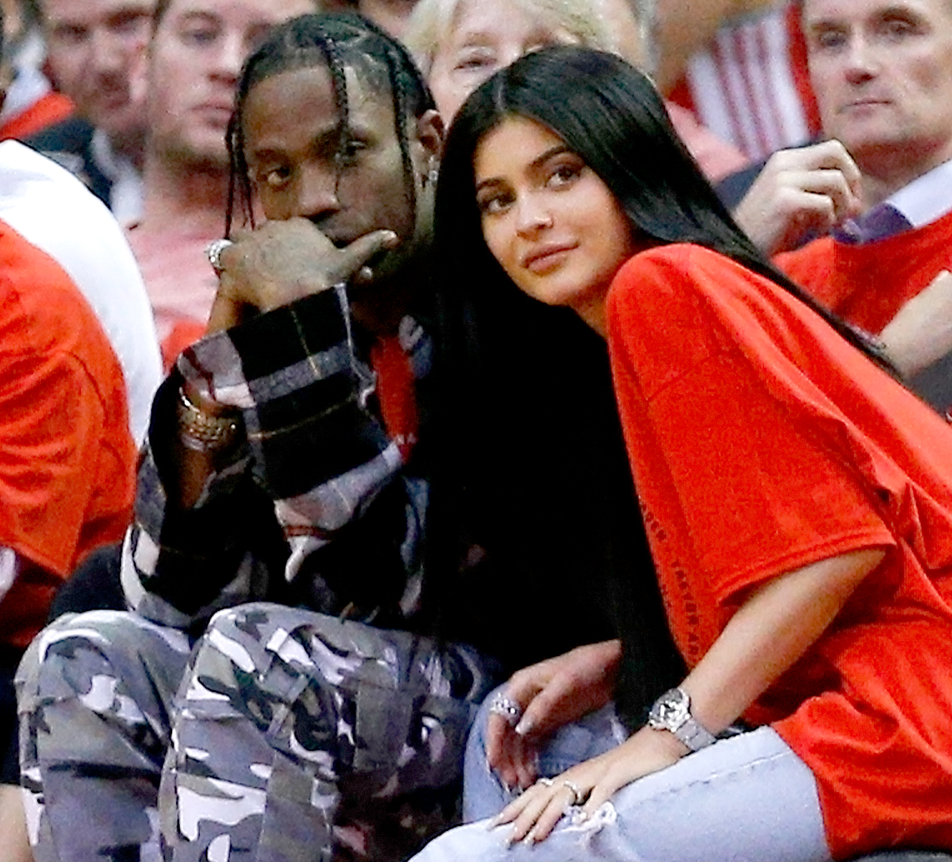 The eyewitness noticed that Kylie’s outfit choice concealed her pregnancy. “Kylie was in a very large oversize hoodie so it was impossible to see a baby bump,” the source said, adding that “Travis and Blake seemed to get along very well.”