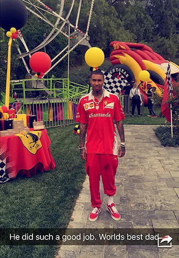 King looked adorable in a red jersey, shorts and sneakers (the same outfit his dad rocked) as he threw up a peace sign for a Snapchat pic in front of Kylie’s pool. The pool was topped with a floating red Ferrari made entirely out of balloons.