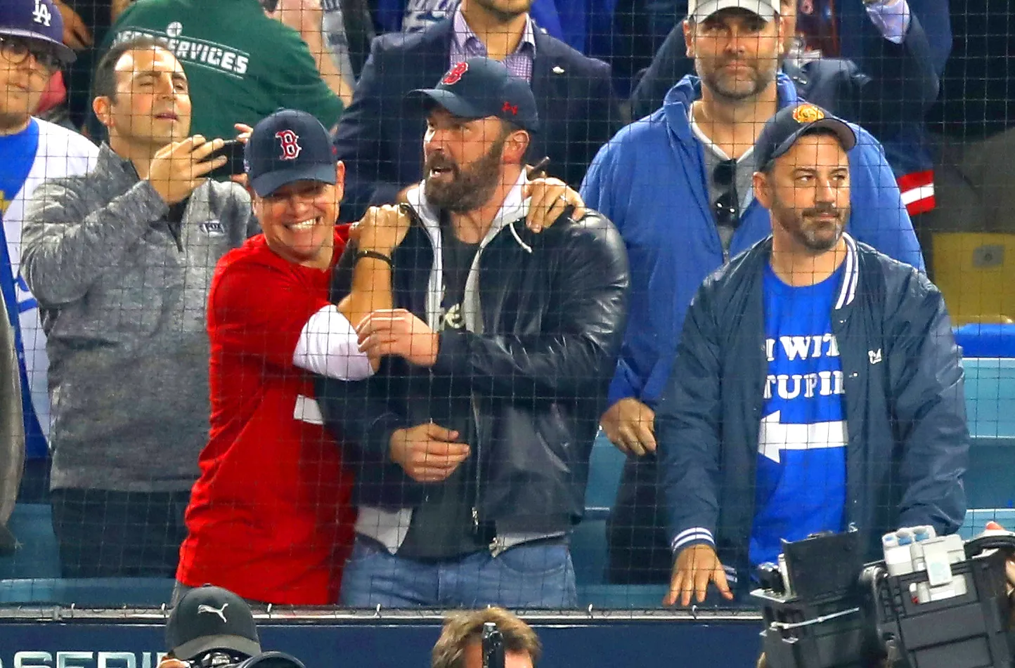 A comedic home run! Matt Damon and Jimmy Kimmel continued their faux-feud at Game 5 of the World Series, both wearing “I’m With Stupid” T-shirts with arrows pointing at each other.