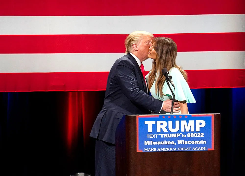 Standing by her man. At a Monday, April 4, Wisconsin rally for Donald Trump, his wife, Melania Trump, addressed recent criticism against the Republican presidential candidate over his treatment of women.
