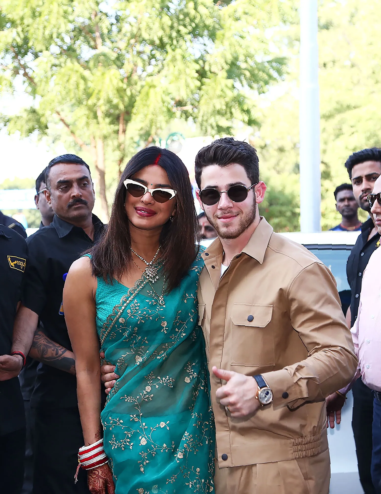 The new husband and wife faced photographers in Jodhpur on Monday, December 3, with Chopra showing off her henna tattoos and Nick flashing a gold wedding band as he gave a thumbs-up.