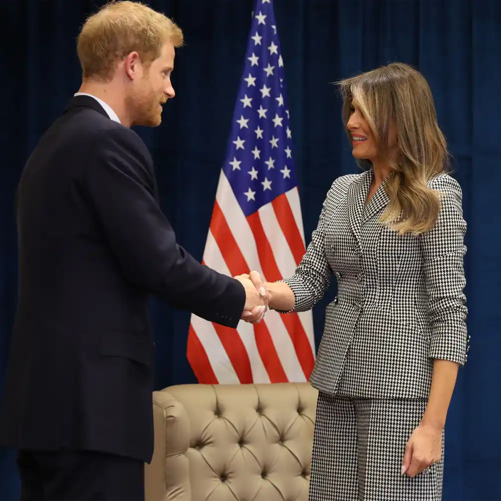 Looking elegant in a black and white checkered suit, the former model, 47, beamed while shaking hands with Harry as they posed for photographers in front of American and Britain flags. The prince looked dapper in a dark navy suit with a maroon tie, and kindly thanked Trump for joining him. The two chatted briefly in front of reporters.