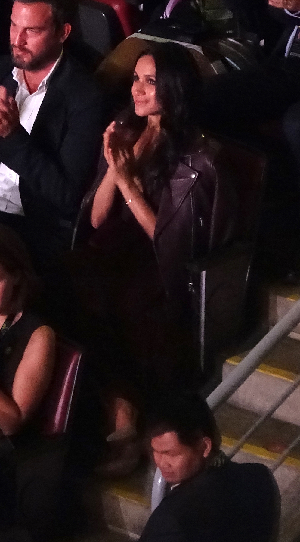 Markle, who films the USA Network drama in the Canadian city, smiled and cheered as she wore a purple dress with a matching Mackage Baya leather jacket draped over her shoulders. She sat beside her friend Markus Anderson, who introduced the pair, and left the arena after Harry’s speech.