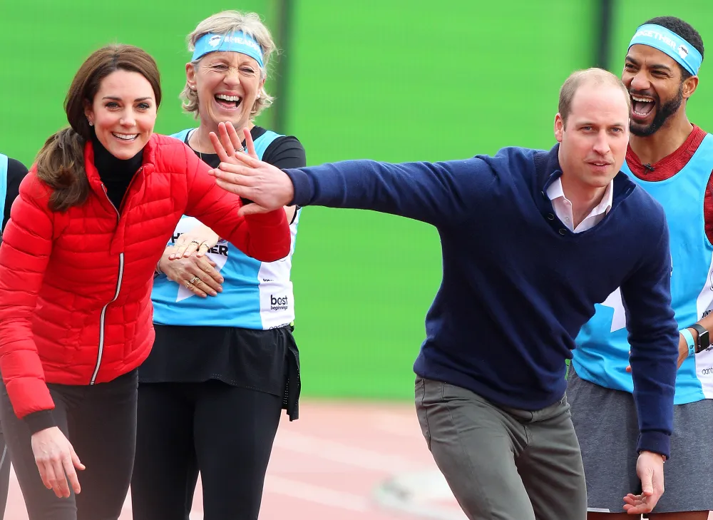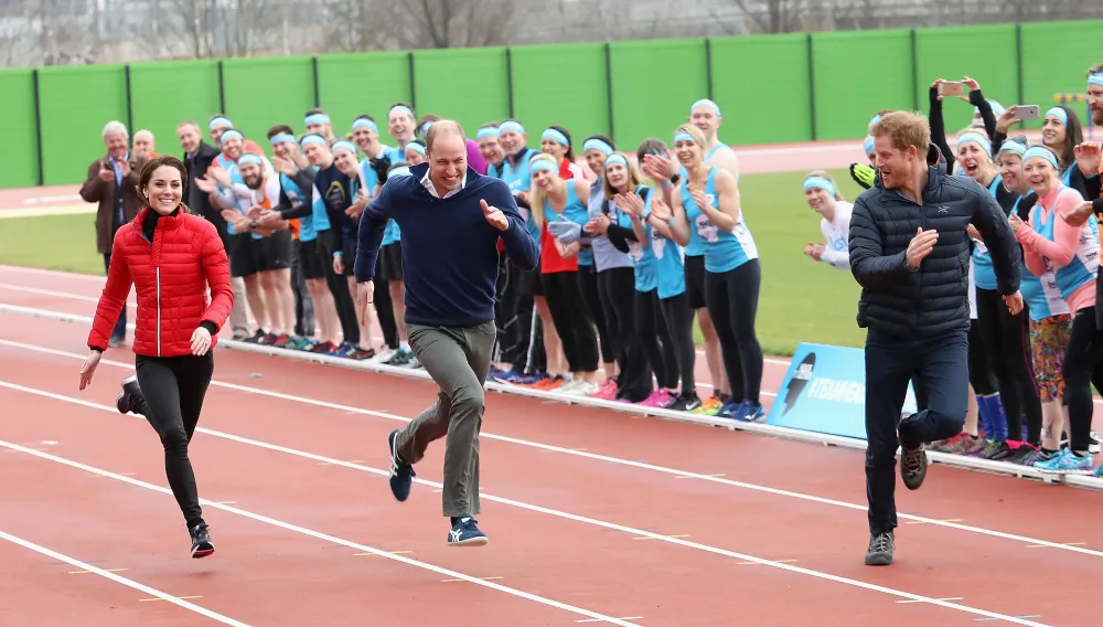 The trio headed to Queen Elizabeth Olympic Park’s London Marathon Community Track, where they met with 150 volunteers from the Heads Together mental-health organization who were training for the 2017 London Marathon, which will take place on April 23.