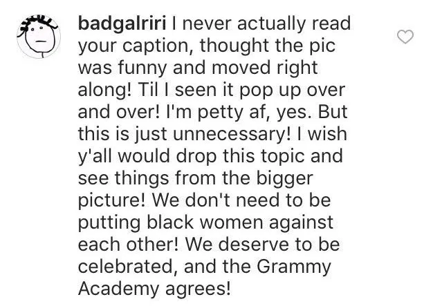“I never actually read your caption, thought the pic was funny and moved right along! Til I seen it pop up over and over!” she wrote. “I’m petty af, yes. But this is just unnecessary! I wish y’all would drop this topic and see things from the bigger picture! We don’t need to be putting black women against each other! We deserve to be celebrated, and the Grammy Academy agrees!”
