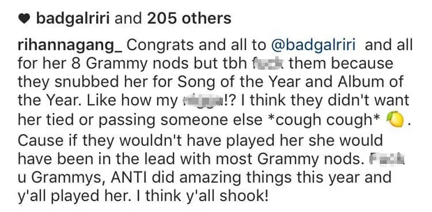 “Congrats and all to @badgalriri and all for her 8 Grammy nods but tbh f–k them because they snubbed her for Song of the Year and Album of the Year,” the fan wrote. “Like how my n—a!? I think they didn’t want her tied or passing someone else *cough cough* [lemon emoji]. Cause if they wouldn’t have played her she would have been in the lead with the most Grammy nods. F–k u Grammys, ANTI did amazing things this year and y’all played her. I think y’all shook!”