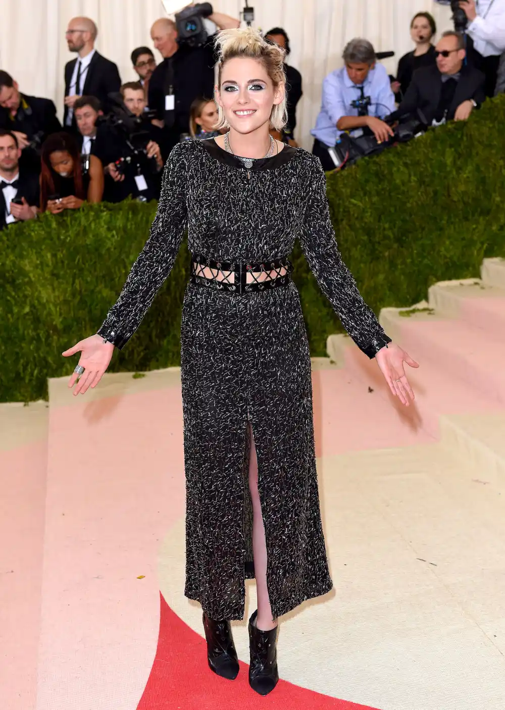 While the lovebirds were affectionate on the carpet, Pattinson’s ex-girlfriend of three years, Stewart, was a short distance away. The American Ultra actress, 26, attended the Met Gala solo — without her girlfriend of a month, French singer Soko — but was primped and ready to party the night away with her fellow A-listers. The currently blonde star stunned in a design by Karl Lagerfeld: a sequin, metallic, gunmetal dress with a deep slit at the front of her legs. Showing off a sexy sliver of her flat tummy and and confidently posed for photographers before walking up the storied entrance of the museum.
