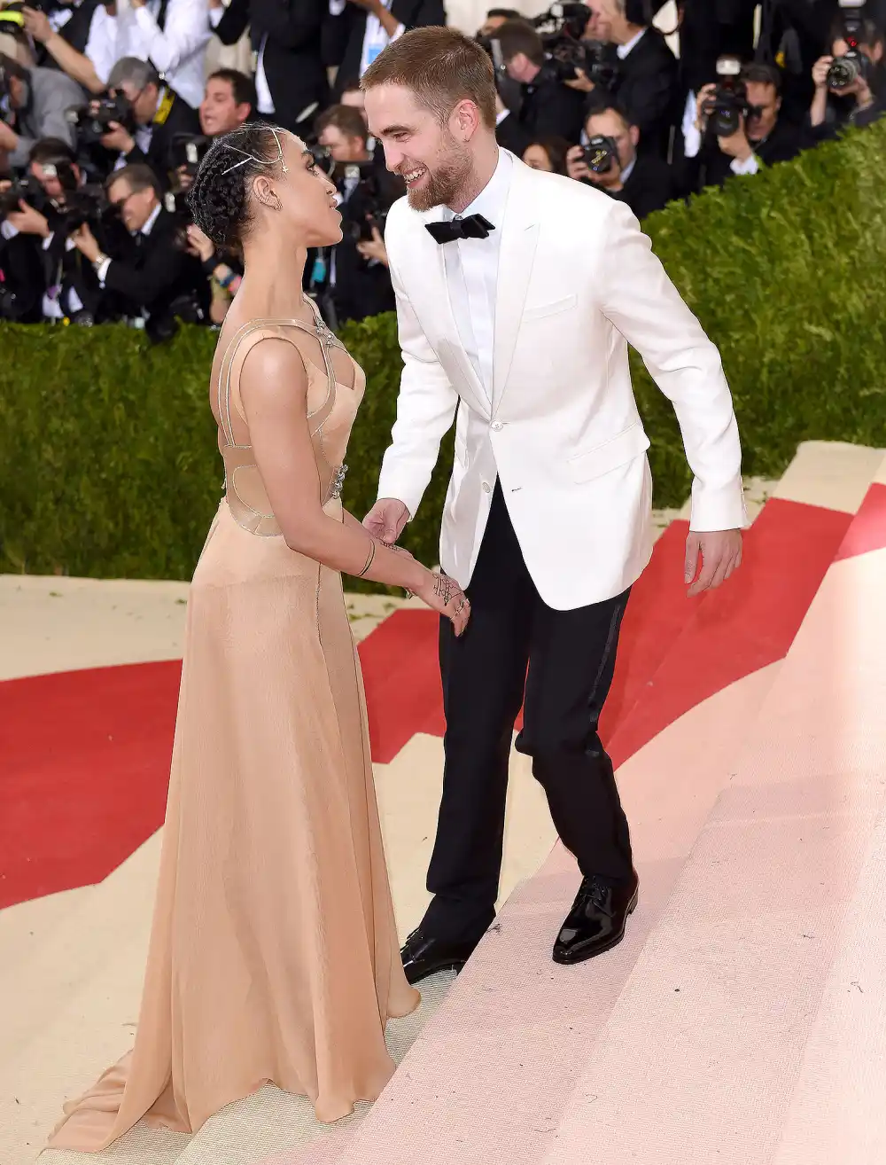 With fiancee FKA twigs on his arm, Twilight hunk Pattinson, 29, dressed for the formal occasion in a white crepe tuxedo jacket and black slacks. He dashingly led the way on the red carpet of the Metropolitan Museum of Art’s Costume Institute Gala and helped his beautiful bride-to-be up the steps of the institution.
