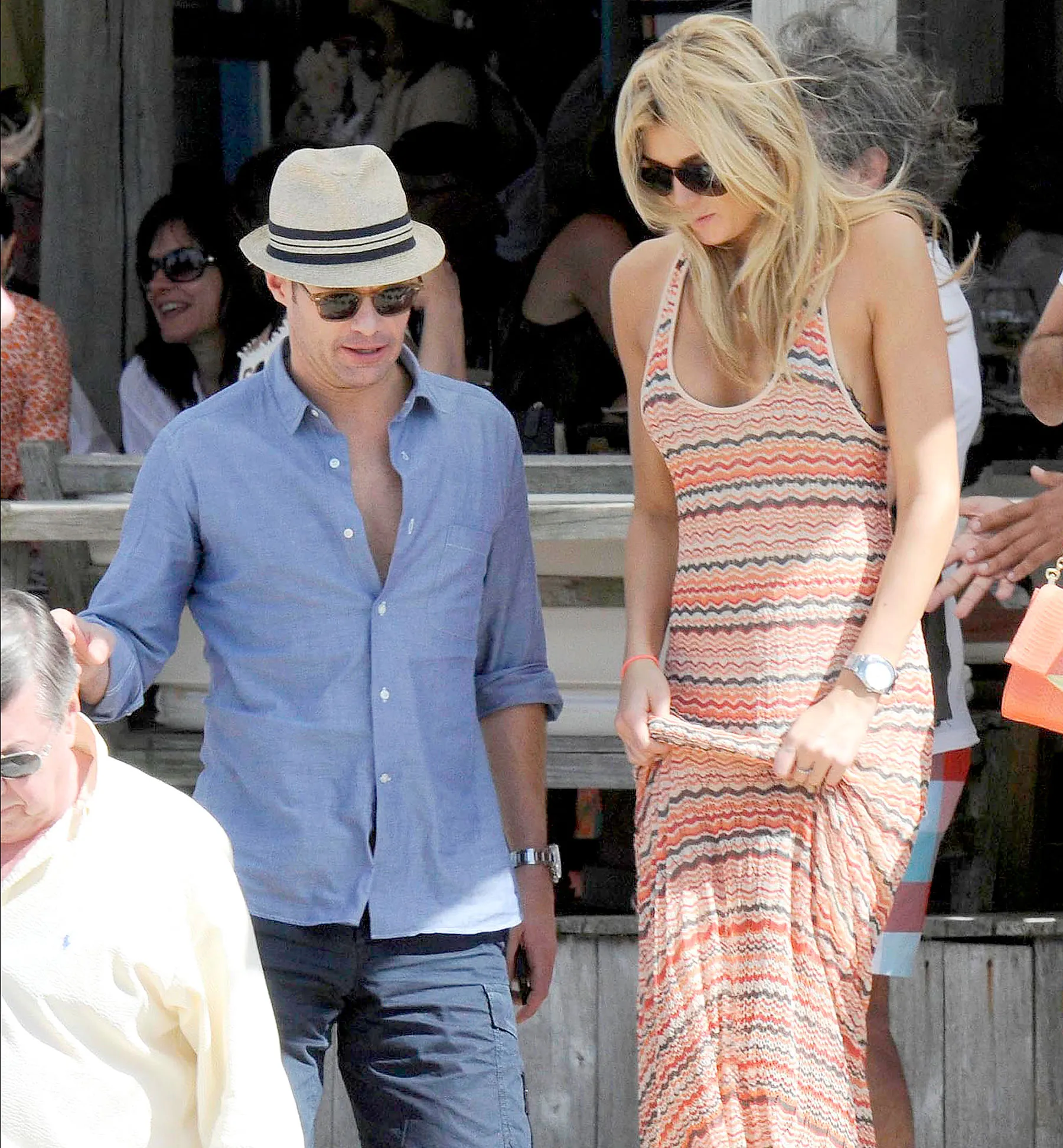 Seacrest was dressed for the beach in a half-unbuttoned blue dress shirt, shorts, flip-flops, sunglasses and fedora. Taylor showed some cleavage in a low-cut, colorful maxi dress, and wore sandals and dark shades.