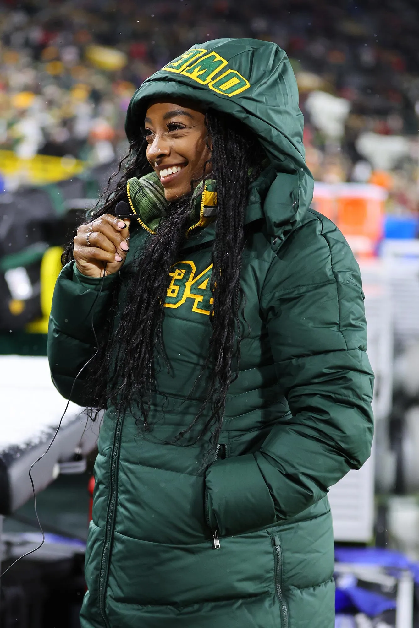 Simone Biles is a proud football wife, cheering as husband Jonathan Owens and the Green Bay Packers play the Tampa Bay Buccaneers on Sunday, December 17.