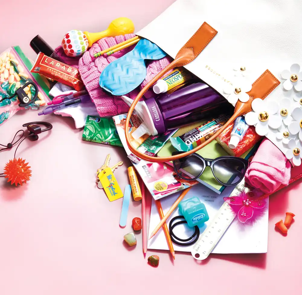 The 42-year-old actress, who is mom of Emily, 4 months (with husband Ted Griffin), spills her Marc Jacobs tote for Us.
