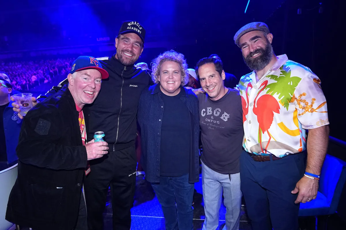 Jason and Travis, who cohost their weekly “New Heights” podcast, usually live far away from one another. While Travis is based in Kansas City, where he plays for the Chiefs, Jason lives in Philadelphia with wife Kylie Kelce and their four daughters. (Jason and Kylie, 33, share Wyatt, 5, Ellie, 4, Bennett, 2, and Finnley, who was born in March.)