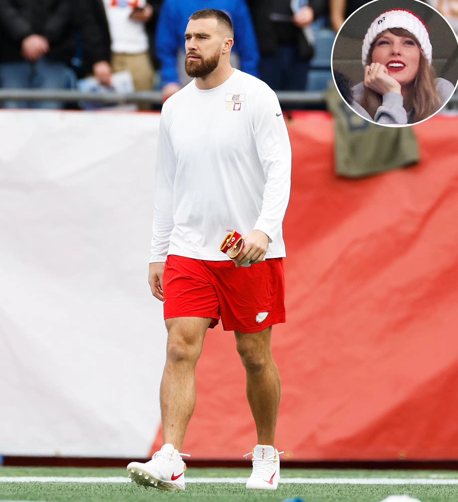 While Kelce got a glimpse of Swift via the poster prior to his matchup, the “Lover” singer was also spotted in attendance as the Chiefs took on the New England Patriots on Sunday.
