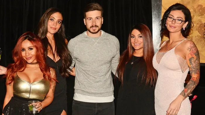 The ladies of the Jersey Shore — Deena Cortese, Jenni “JWoww” Farley and Nicole “Snooki” Polizzi — plus mama’s boy Vinny Guadagnino arrived at the midtown Manhattan restaurant and lounge by 8:45 p.m. Instead of heading straight to the bar, they made sure the photographer (plus husbands, fiancés and BFFs using iPhones) snapped multiple pictures of their reunion. Once everyone had secured the perfect Instagram shot, the Jersey Shore group settled into a corner booth by the DJ, who pumped Drake, Justin Bieber and The Chainsmokers throughout the night.