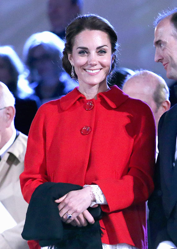 While William, 33, and Harry, 31, donned the official Windsor uniform, with red collar and cuffs on their jackets, Kate, 34, wore at $5,995 Dolce & Gabbana lace dress topped with a $99 red Zara blazer. The mom of two accessorized her look with drop diamond earrings on loan from the Queen.