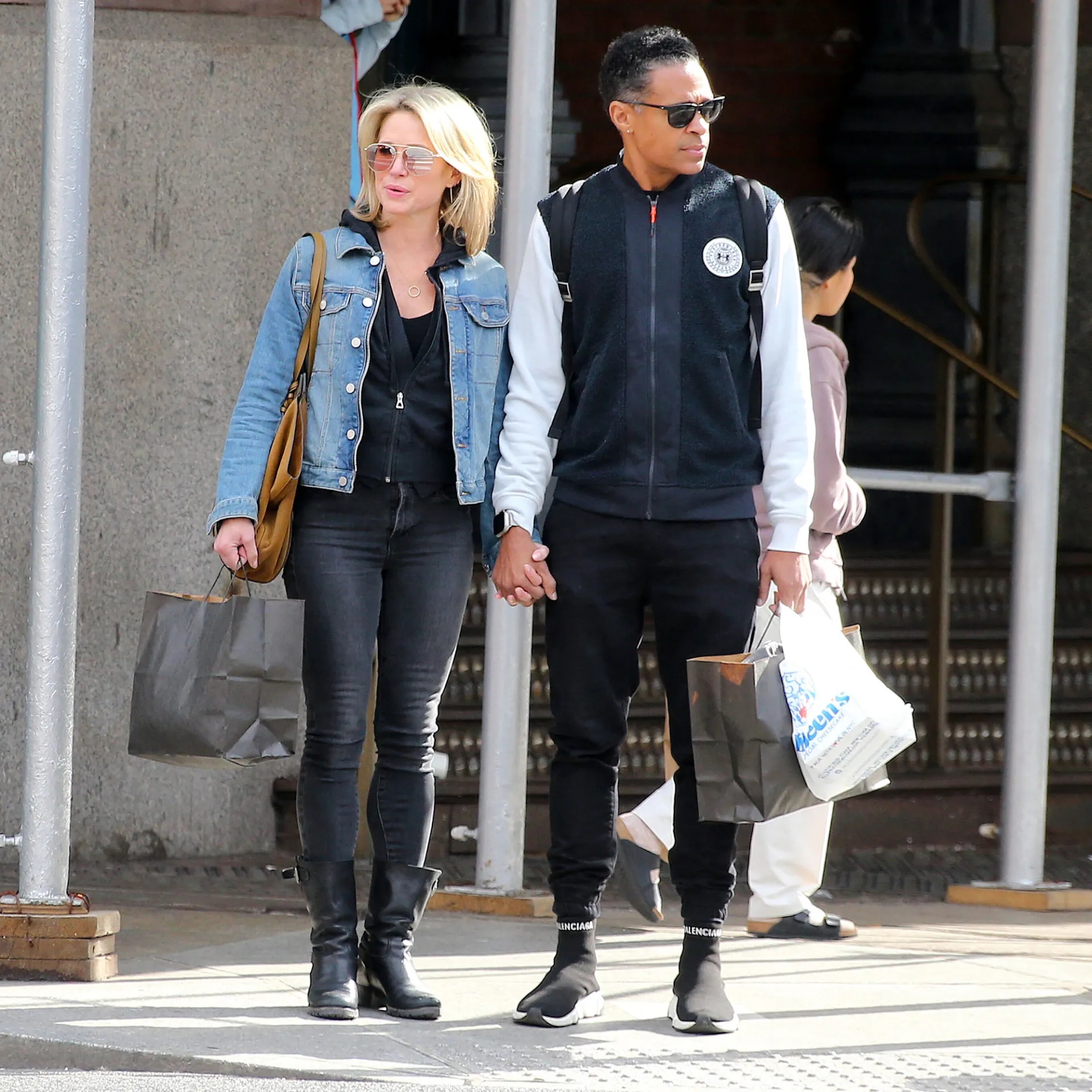The former coanchors exchanged a kiss by a Manhattan subway station on Thursday, March 23, before walking down the street holding hands. Robach, 50, wore a denim jacket over a black zip-up hoodie, black pants, black boots and aviator-style sunglasses. Holmes, 45, for his part, wore a black fuzzy vest over a long-sleeve white sweatshirt, black joggers, black sunglasses and Balenciaga sneakers.