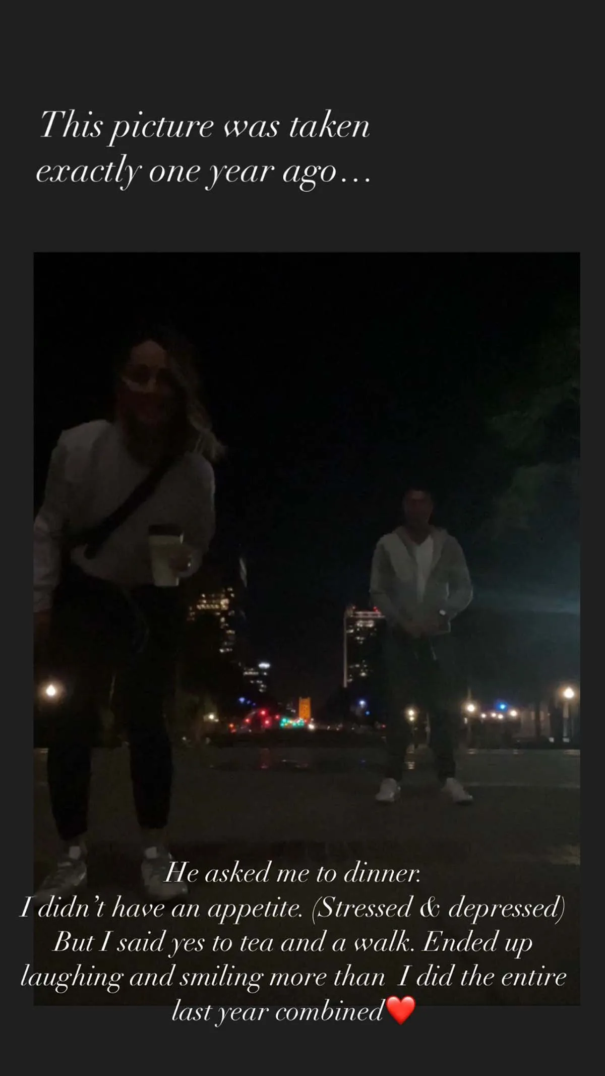 “This picture was taken exactly one year ago,” the former Bachelorette wrote on September 25, 2022, via Instagram. “He asked me to dinner. I didn’t have an appetite. (Stressed & depressed) But I said yes to tea and a walk. Ended up laughing and smiling more than I did the entire last year combined.”