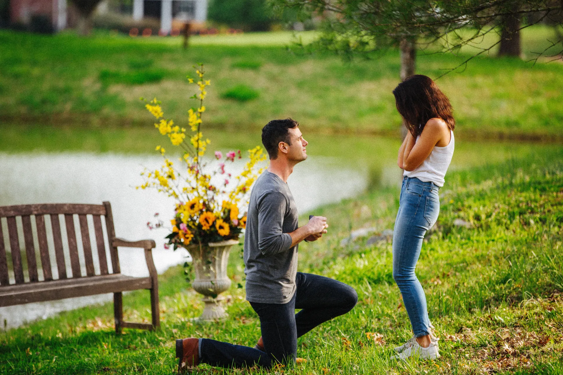 “I went back to a pond behind her house, and we had set it up with sunflowers near a bench. It’s right in their backyard, but a little hidden. I proposed and her family and mine were watching from a distance, and then we all celebrated together,” he told ET.