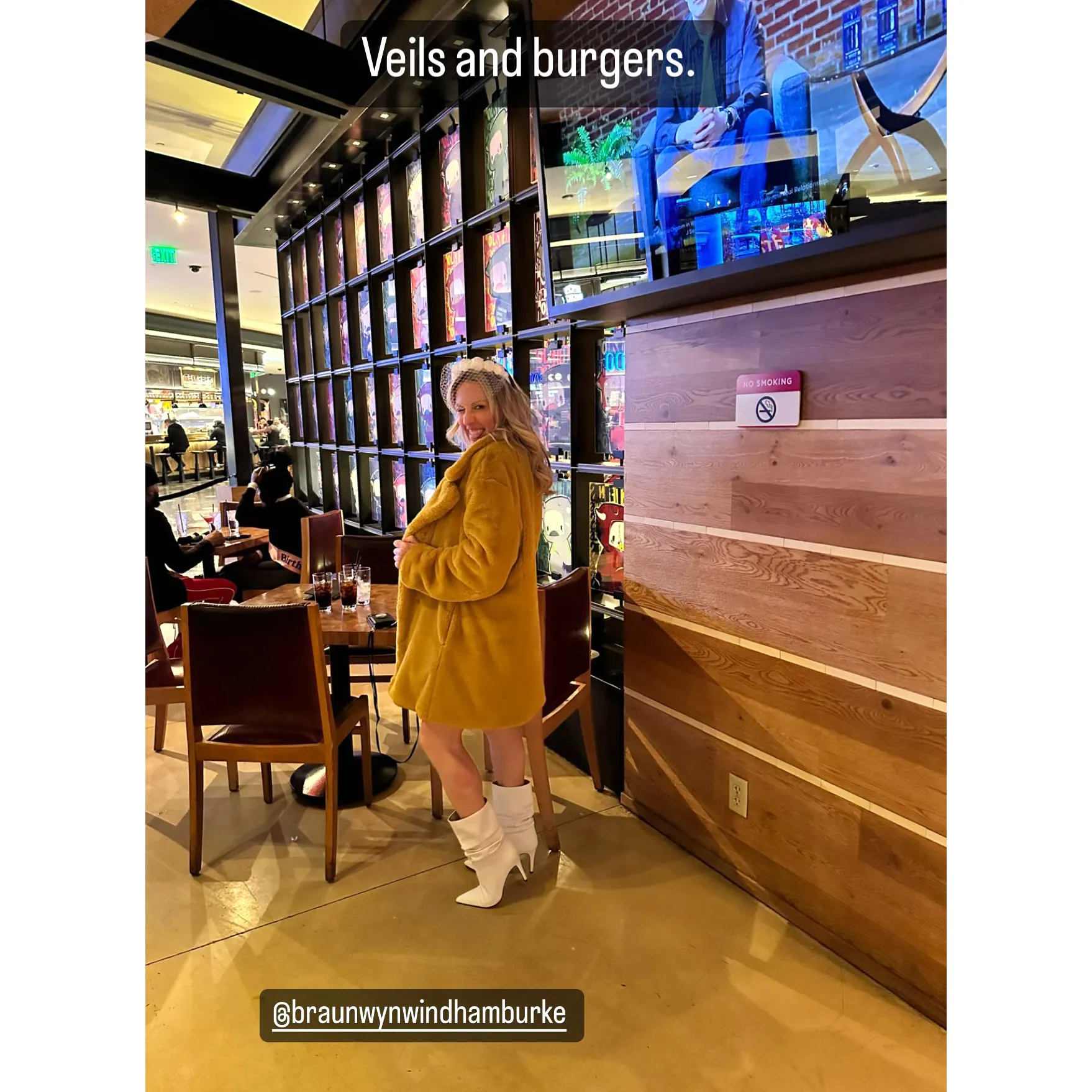 Spinner also posted a close-up of the ladies’ ensembles for their special day, showing off her “Just married the King” T-shirt, seemingly from the Elvis-inspired venue.. In the snap, Windham-Burke wore a white veil, white boots and a white dress with wedding rings printed all over the top.