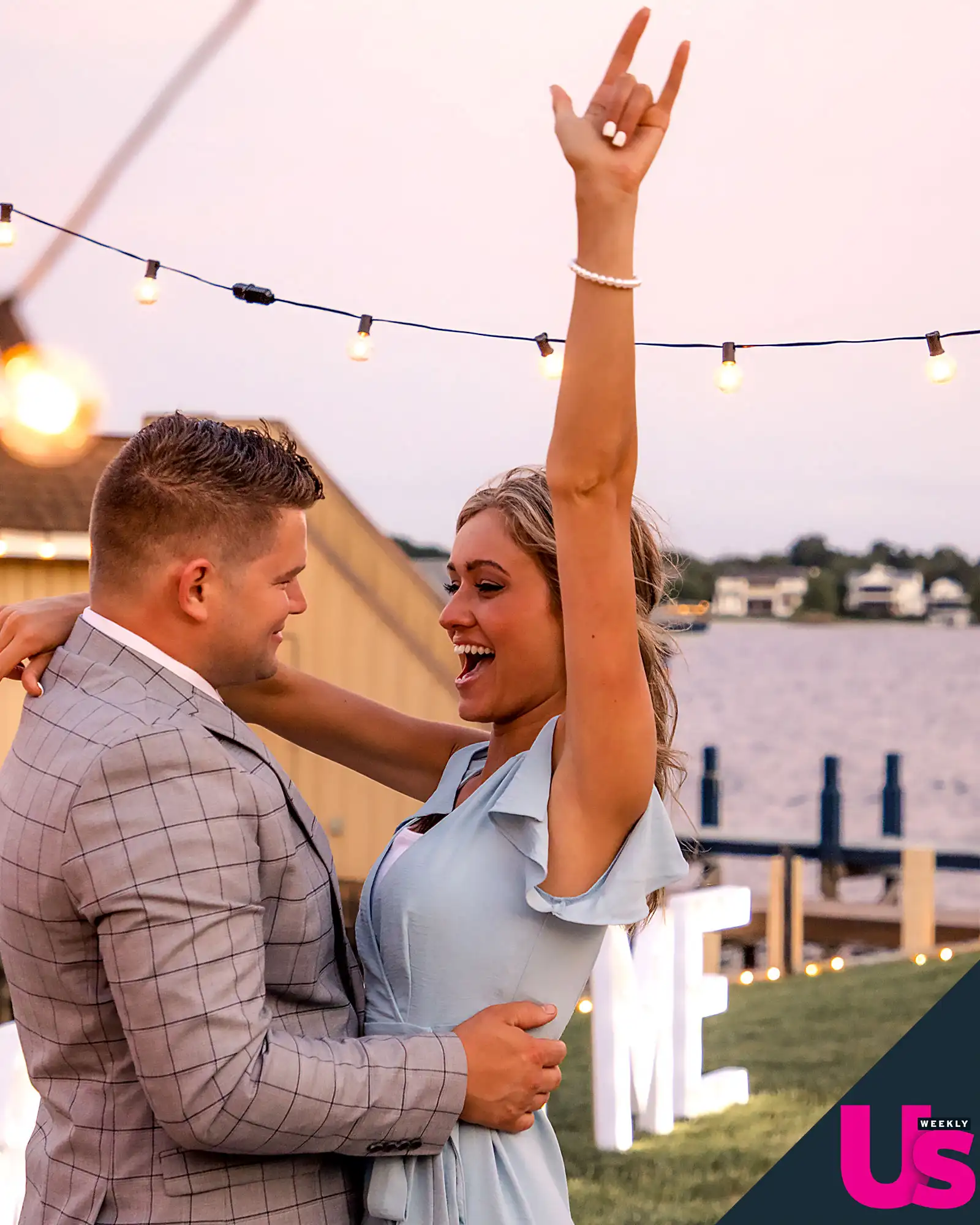 The big moment took place at the home of a family friend in Orlando. When the couple arrived, a backdrop lined with marquee letters spelling “marry me” greeted them. After Bates popped the question (and Keyes said yes!) the couple enjoyed a special dinner, dance and fireworks.