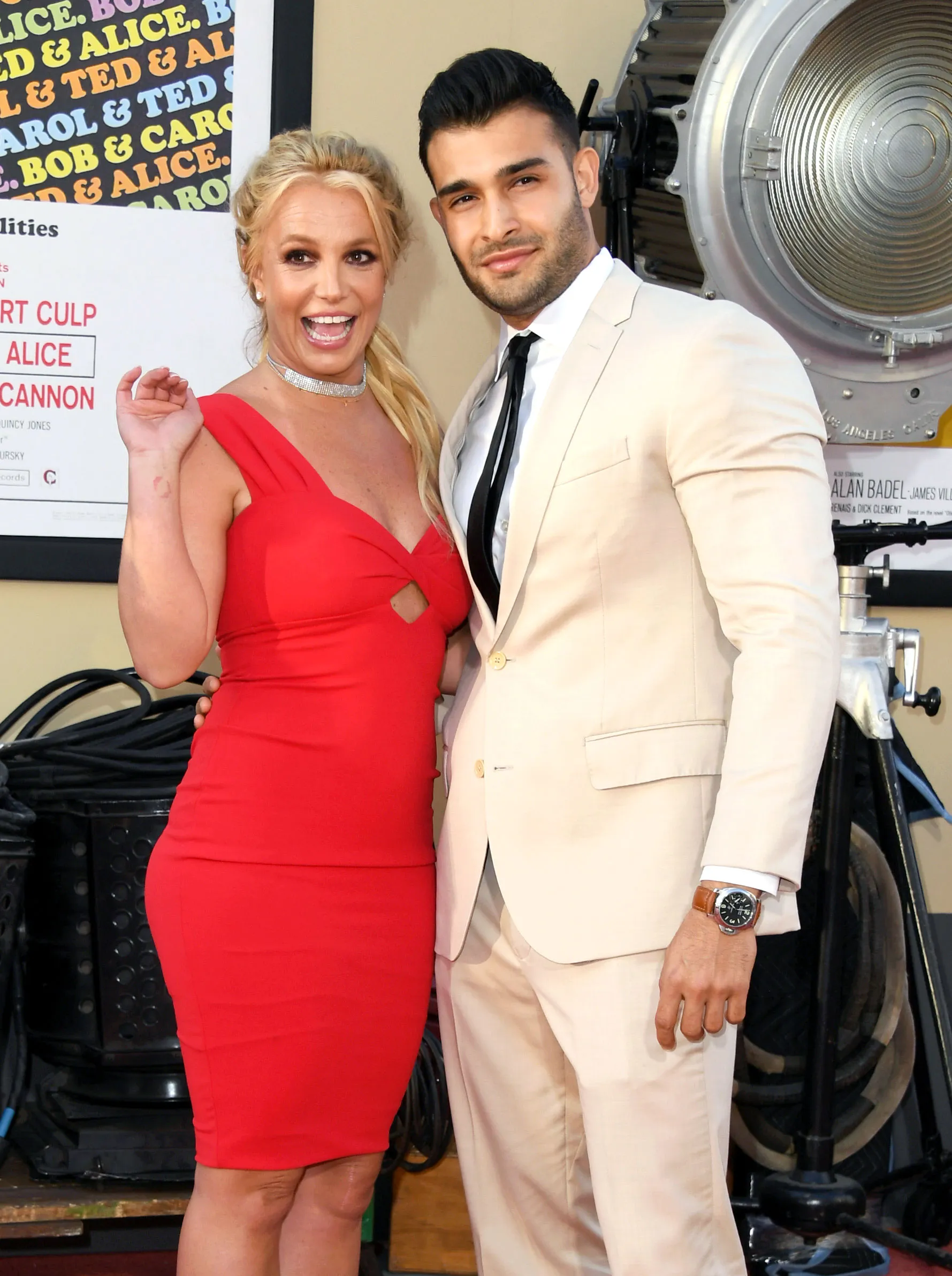 Spears looked gorgeous in a red one-shoulder dress, a silver choker and black heels, while Asghari wore a cream-colored suit over a white button-down shirt and a black tie.