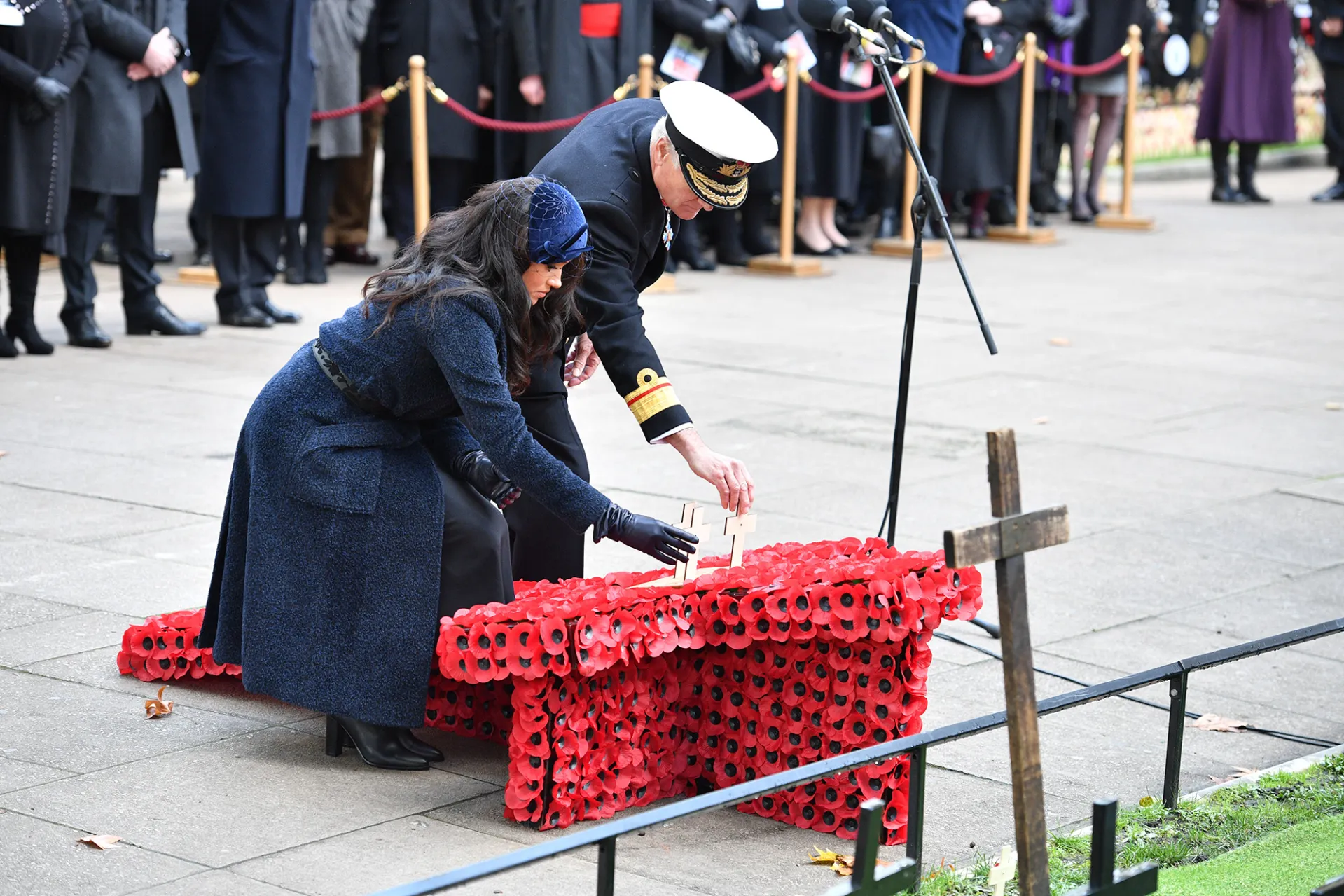 Harry, 35, previously attended the event at Westminster Abbey solo for the last two years. On Thursday, however, Meghan, 38, was by his side at the kickoff event for a series of ceremonies leading up to Remembrance Sunday. The former Suits star stunned in a navy blue coat and matching hat for the ceremony at the the Field of Remembrance, which is a memorial garden where former service men and women and members of the public can pay tribute to fallen soldiers. Harry, per tradition, sported his Household Division ceremonial uniform.