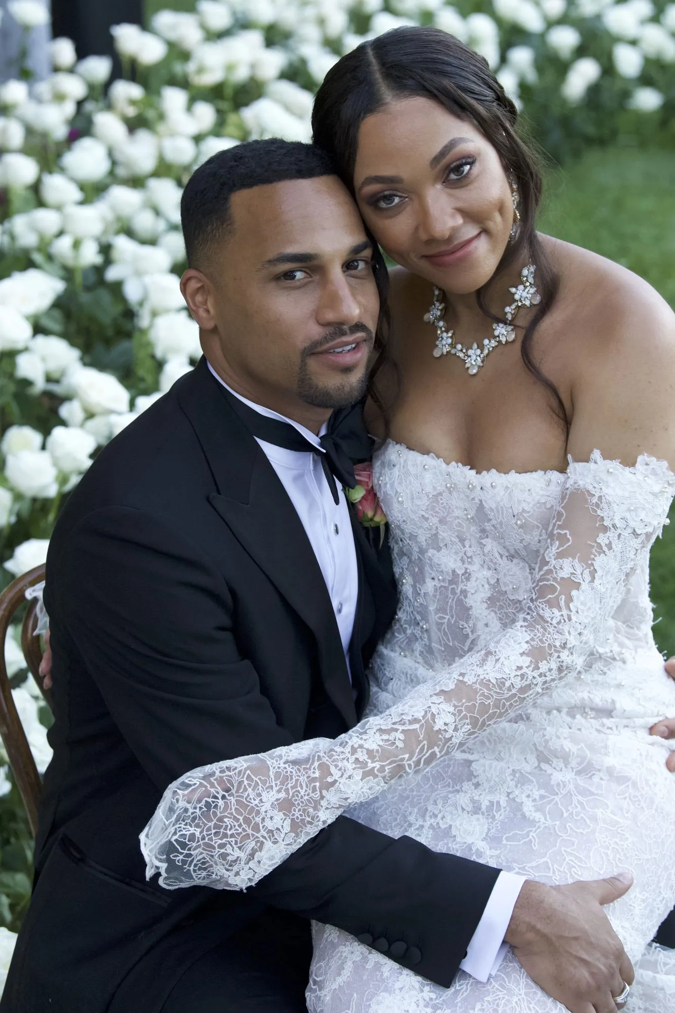 Images from the occasion showed gorgeous white floral arrangements and chandeliers at the outdoor ceremony, with numerous romantic, elegant details. Bria was stunning in an off-the-shoulder, white lace gown by Netta BenShabu while her beau donned a Knot Standard tuxedo style by Dion Lattimore. The bride walked down the aisle with her father and held a beautiful bouquet of white, pink and purple flowers.