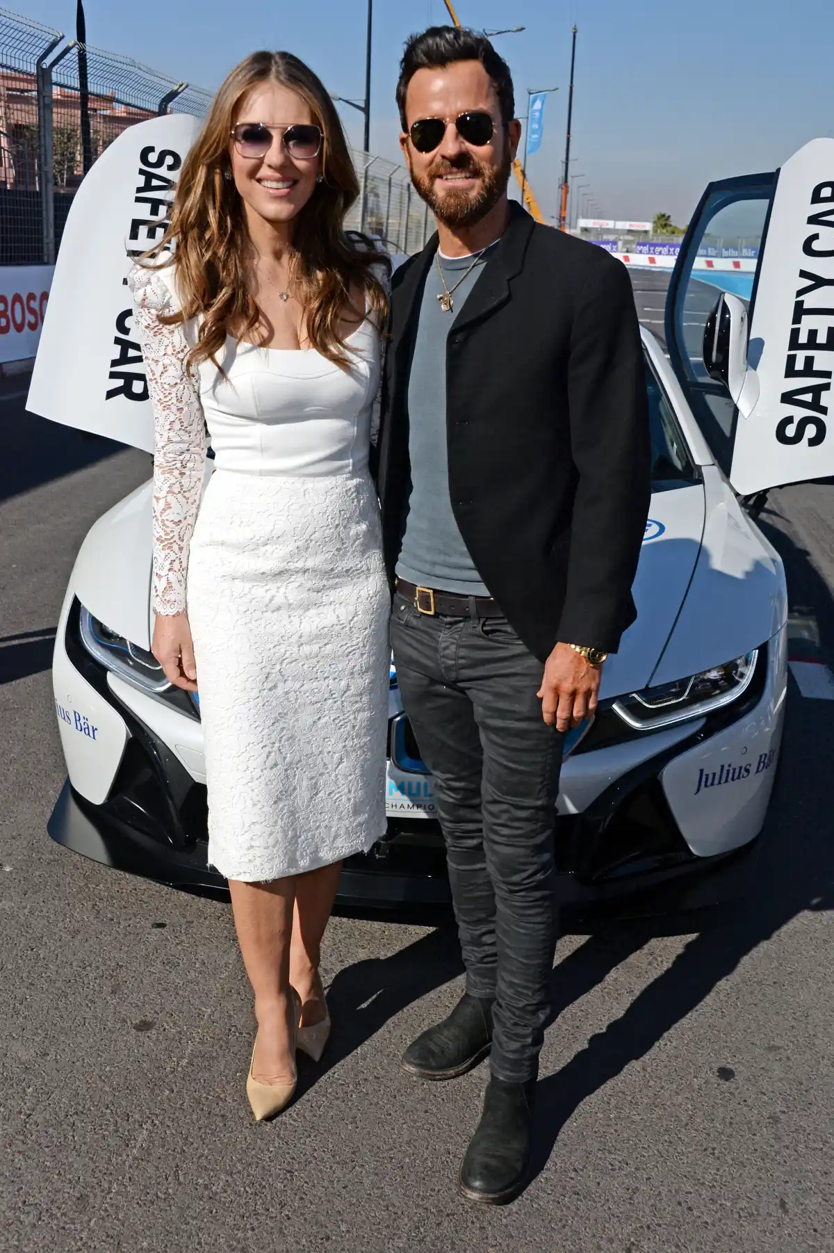 The pair posed side by side at the ABB FIA Formula E 2019 Marrakesh E-Prix on Saturday, January 12. Hurley, 53, wore a figure-hugging white midi dress and nude heels, while Theroux, 47, opted for a black blazer and jeans.