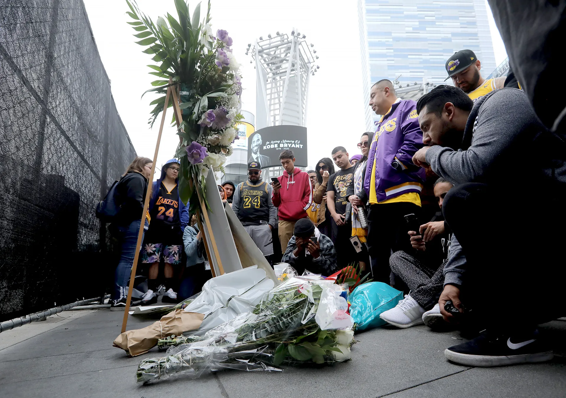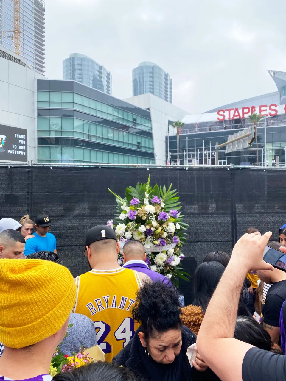 Outside of the arena, basketball lovers broke their emotional silence to cheer as a screen flashed a photo of the retired Lakers star reading, “In Loving Memory.”