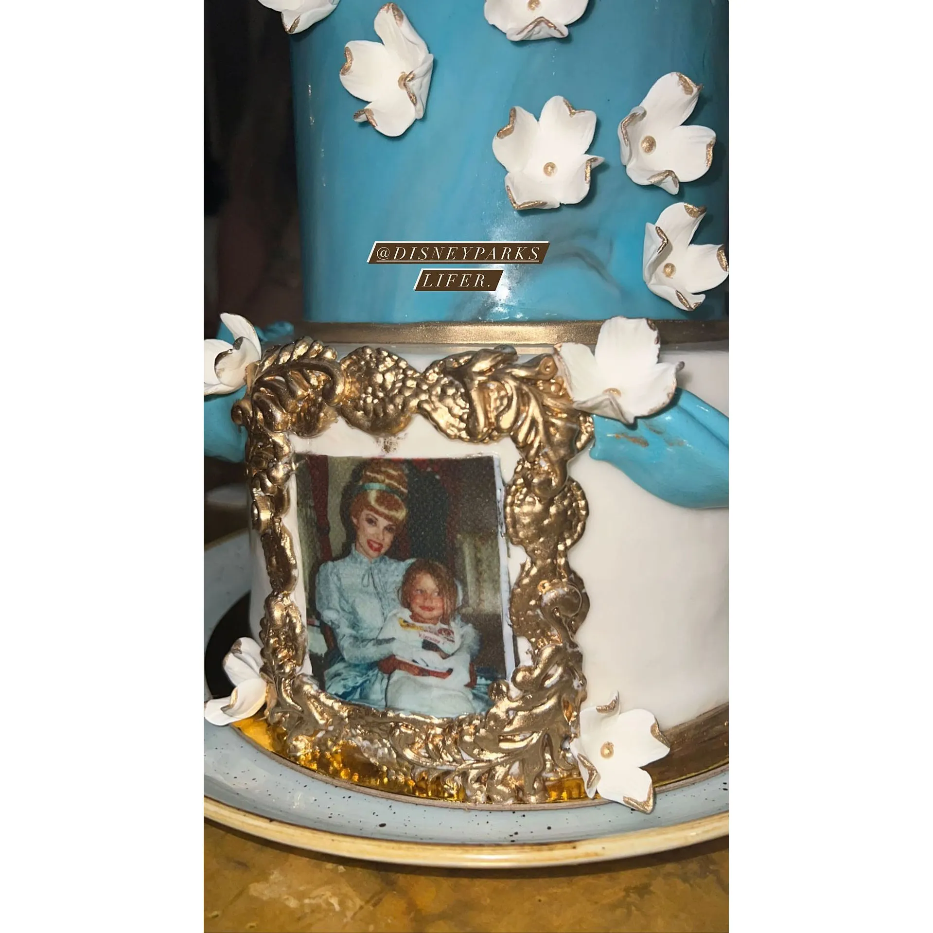 Hadid was treated to a special cake for the occasion: a two-tiered blue and white confection. The treat had a gold crown on top, white flowers and a picture of her with Cinderella from a trip to Disneyland as a child.