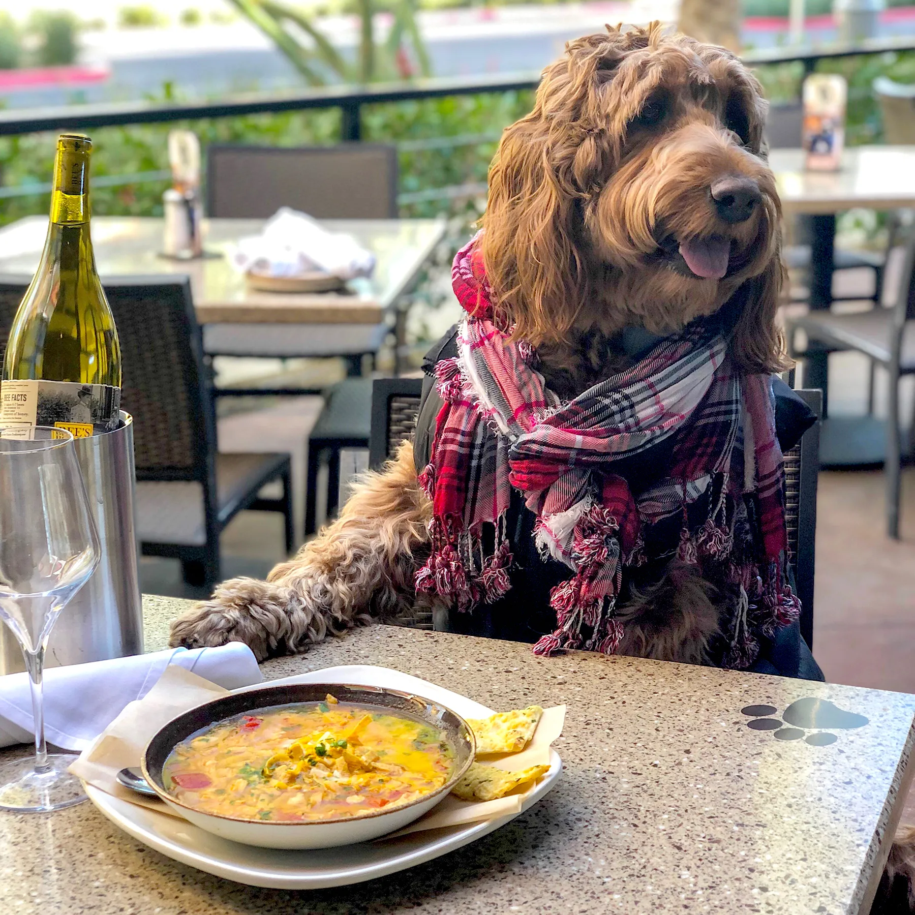The Insta-famous pooch turns heads wherever she goes (elf costume or not) and also has the eyes of more than 58,000 Instagram followers who can’t get enough of her amazing expressions as she dines at tables in her hometown of Las Vegas or when she plays it casual while donning sportswear and an infinity scarf (as you do on Insta).