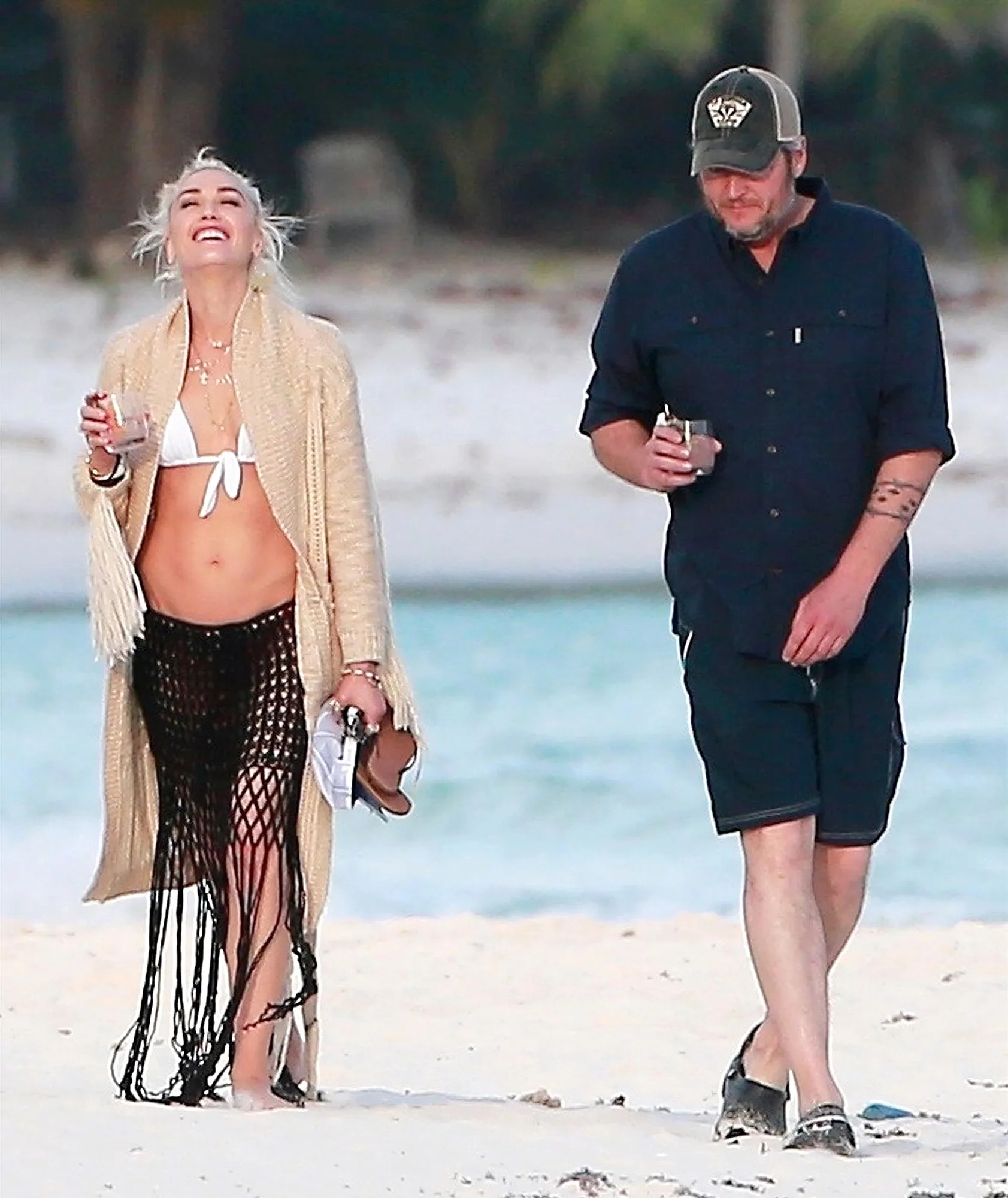 The No Doubt frontwoman looked like a knockout wearing a white bikini top, black net skirt and a beige cover-up on the beach. Shelton was dressed down in a dark blue shirt and shorts while wearing a baseball cap and Crocs.