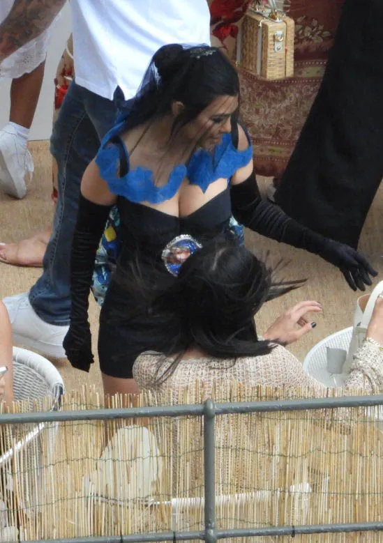The bride, 43, rocked another D&G design on Saturday for her gothic pre-wedding lunch, donning a black mini dress with a matching veil. The black headdress featured a bright blue trim, matching the embellishment on Kourtney’s stomach. The Blink-182 drummer, who proposed to his love on their one-year anniversary in October 2021, also rocked all dark colors.