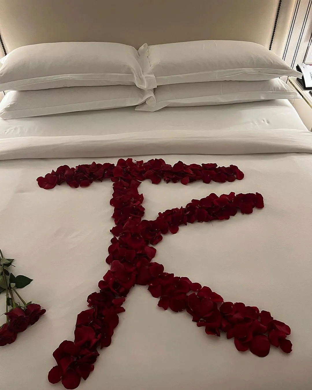The first photo showed the newlyweds on a sunset walk while others showed the romantic setup they had at a hotel. A video showed off their gorgeous oceanfront view while another snap showed their luxurious spread.