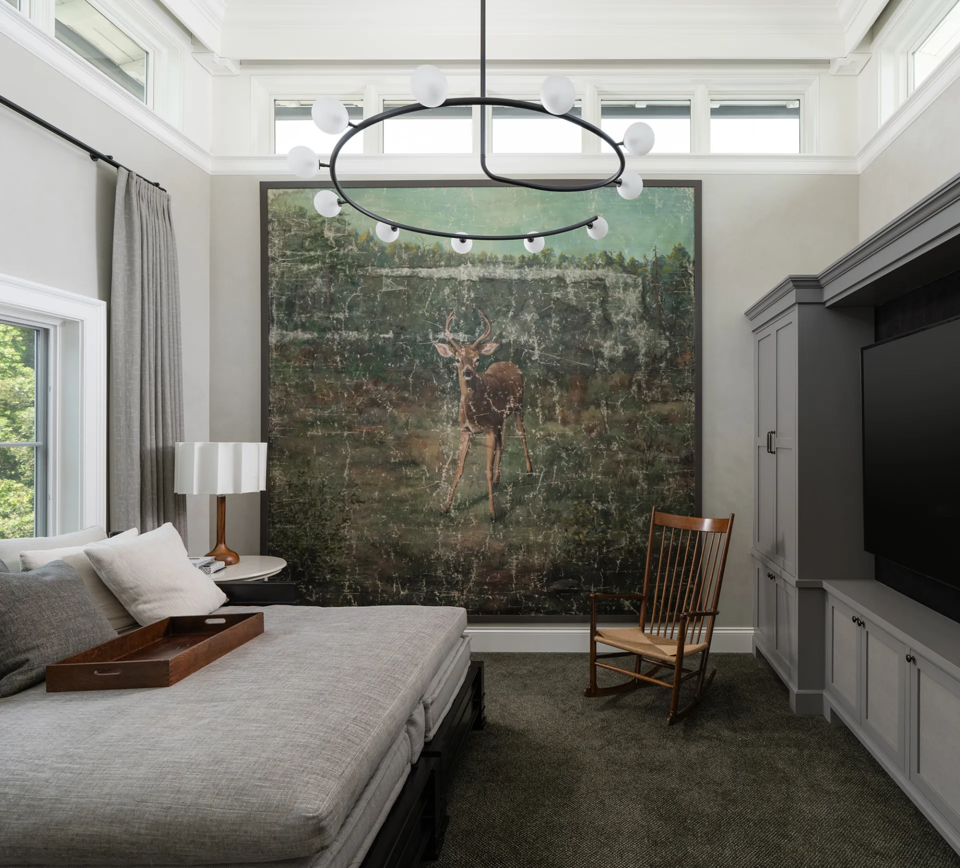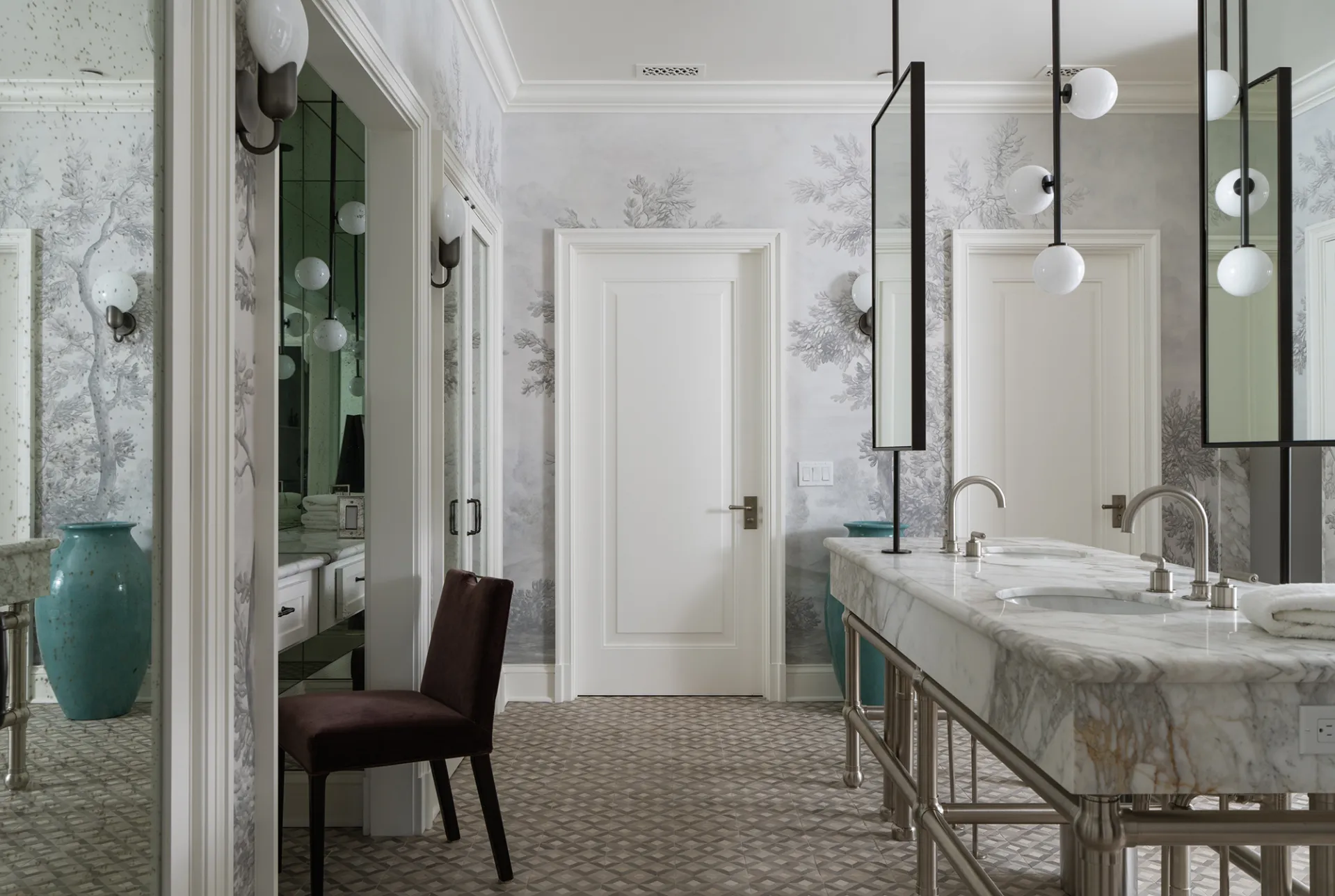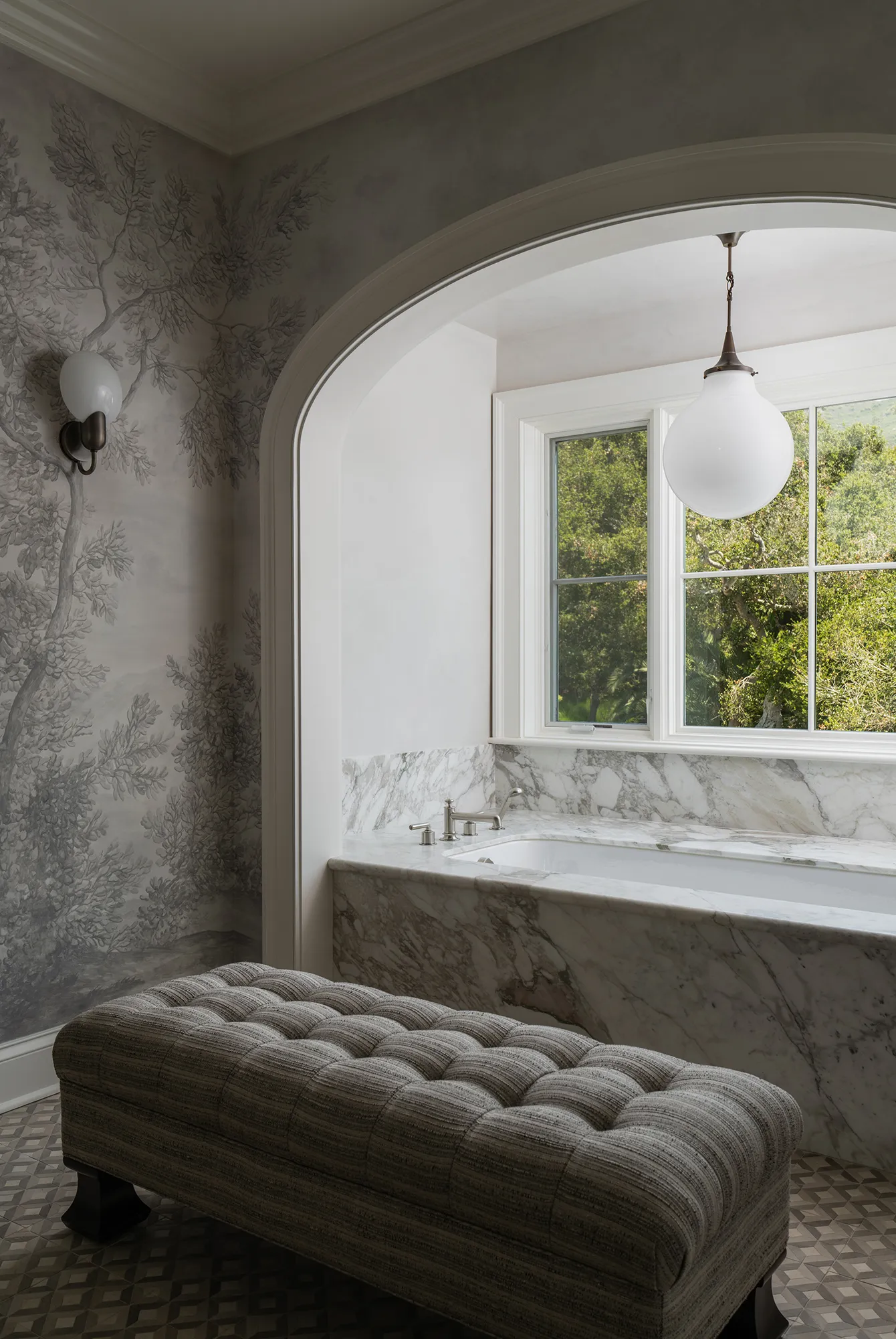 The adjoining bathroom has a matching white marble bathtub, gray and white woodland wallpaper, a custom vanity, and views of the sprawling and lush green natural surroundings, including manicured oak, fruit, and ornamental trees.