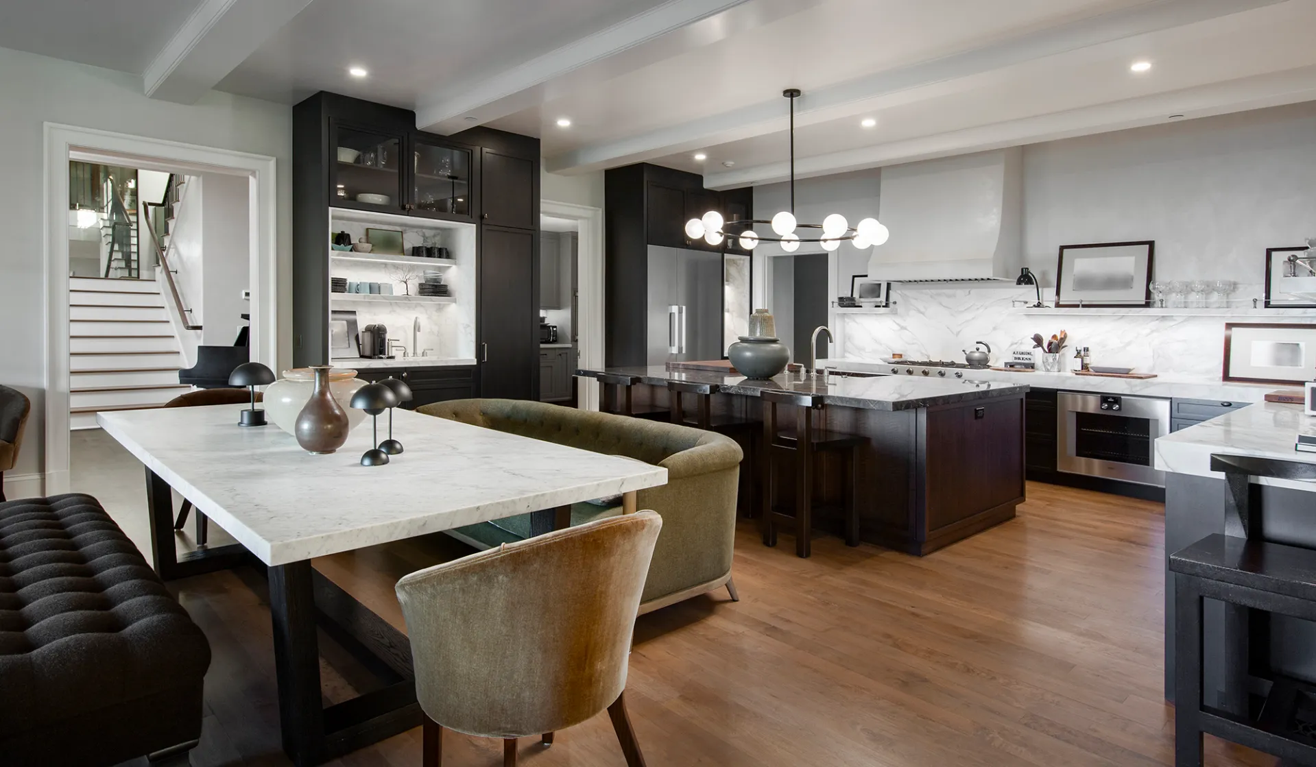 Among Ryan’s other renovations in the main house are an open concept layout between the foyer, kitchen, and dining rooms, and a chef-inspired kitchen featuring white marble countertops, partial open shelving, a giant island, custom dark wood cabinets, and a coffee nook.