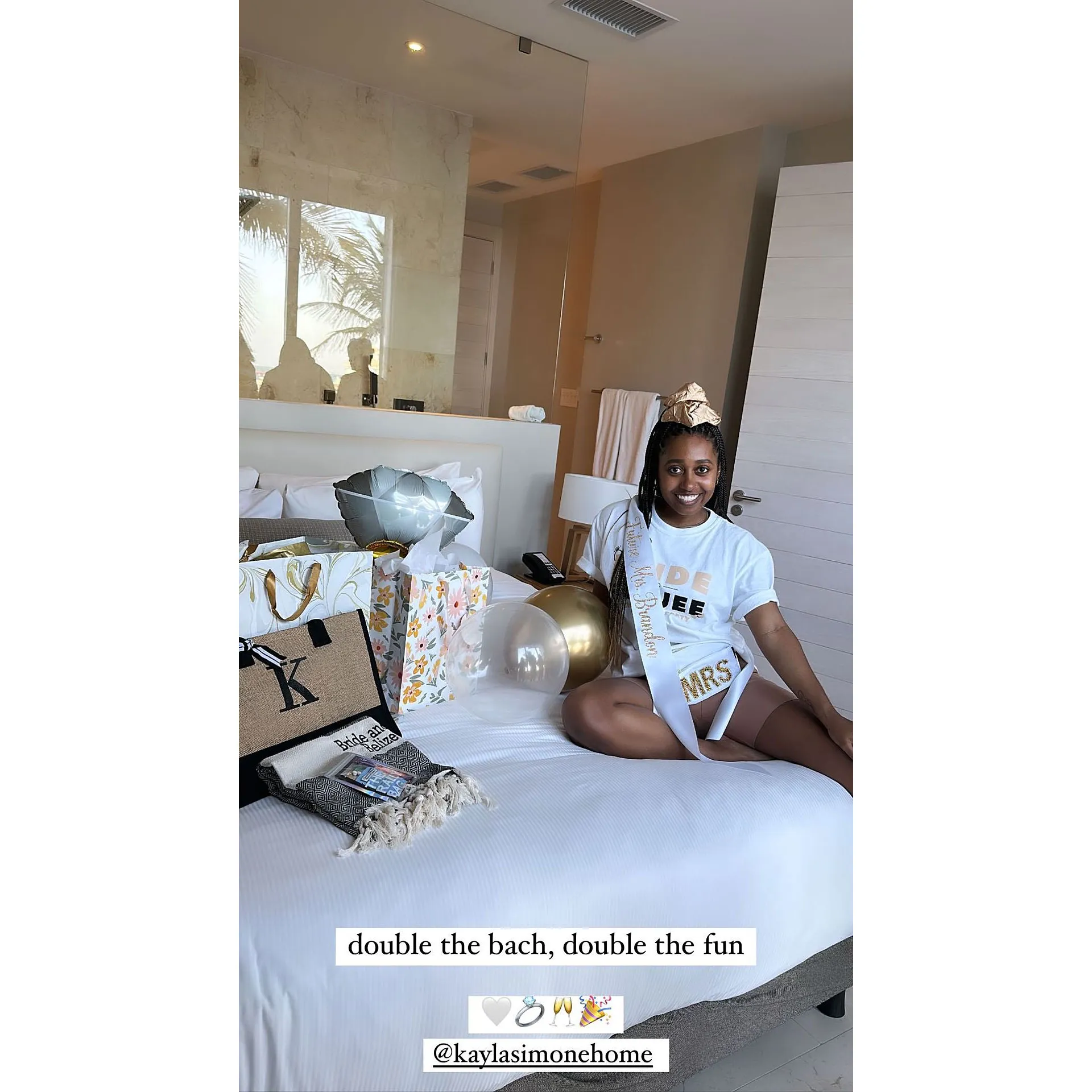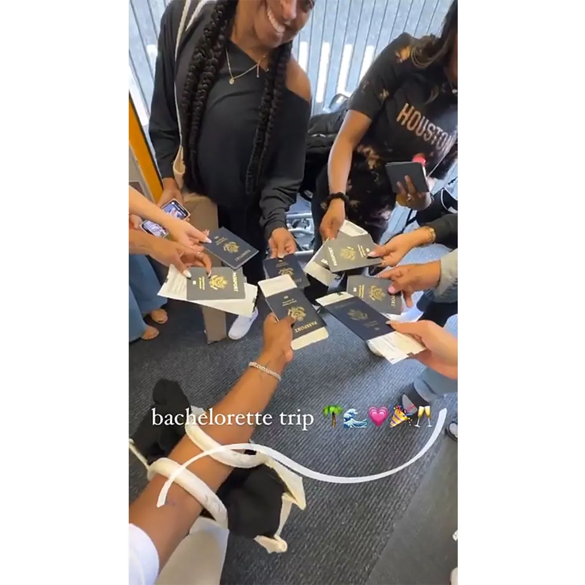 The festivities continued via her Instagram Story, starting with a Boomerang of herself and her party guests showing off their passports before their flight. “Bachelorette trip 🌴🌊💗🎉🥂,” she wrote.