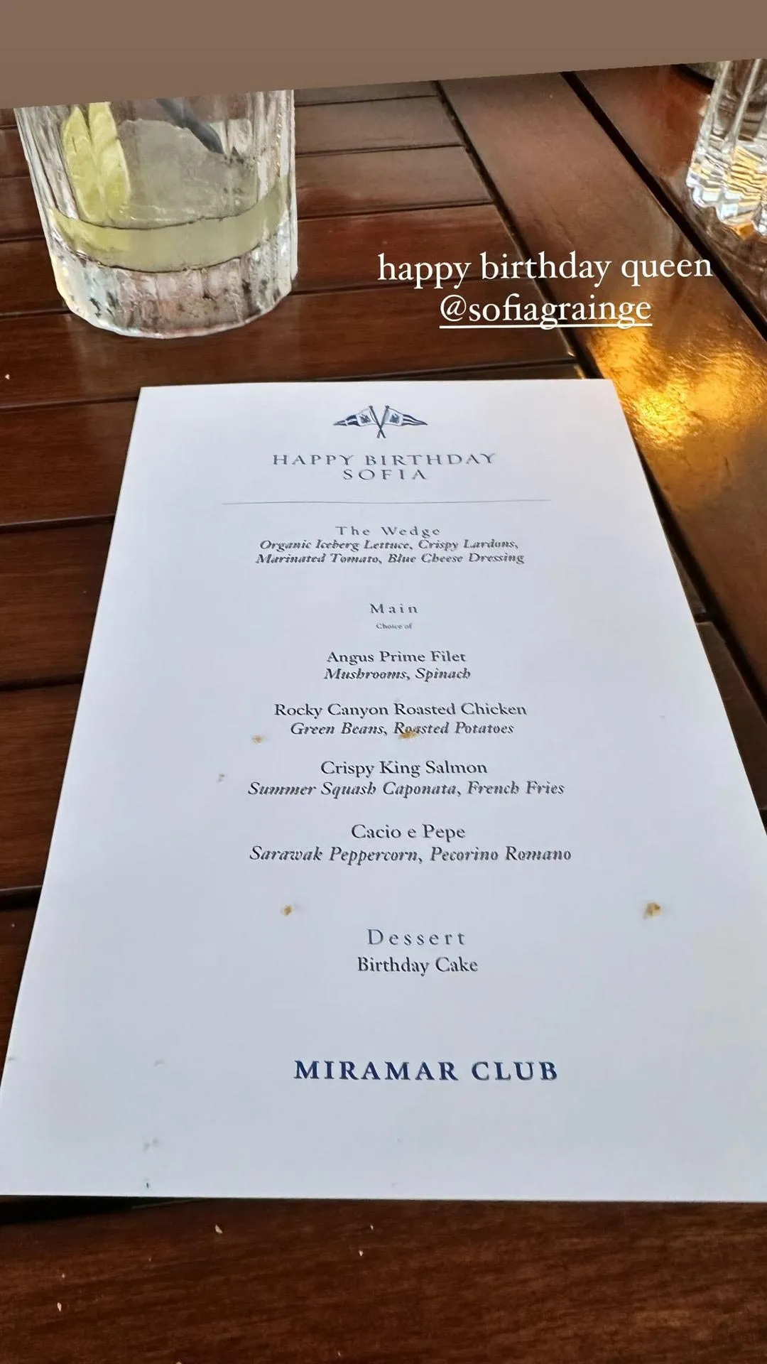 Richie Grainge commemorated the day with a meal at the Miramar Private Beach Club and Resort in Montecito, California. She reposted a pic of the menu via her Instagram Story, which read, “Happy Birthday Sofia.”