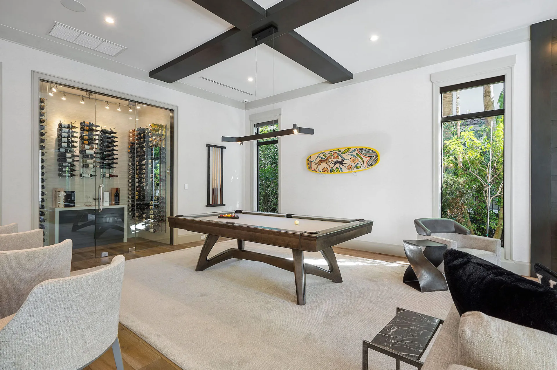 “Private access to a covered balcony provides mesmerizing island views,” the listing continued, adding, “After dark, tuck in for a movie night in the media room, which uses motorized window shades to create a home theater ambiance, and grab a drink from the custom-crafted wooden club bar. A temperature-controlled wine room with a 459-bottle capacity makes storing and serving simple.”