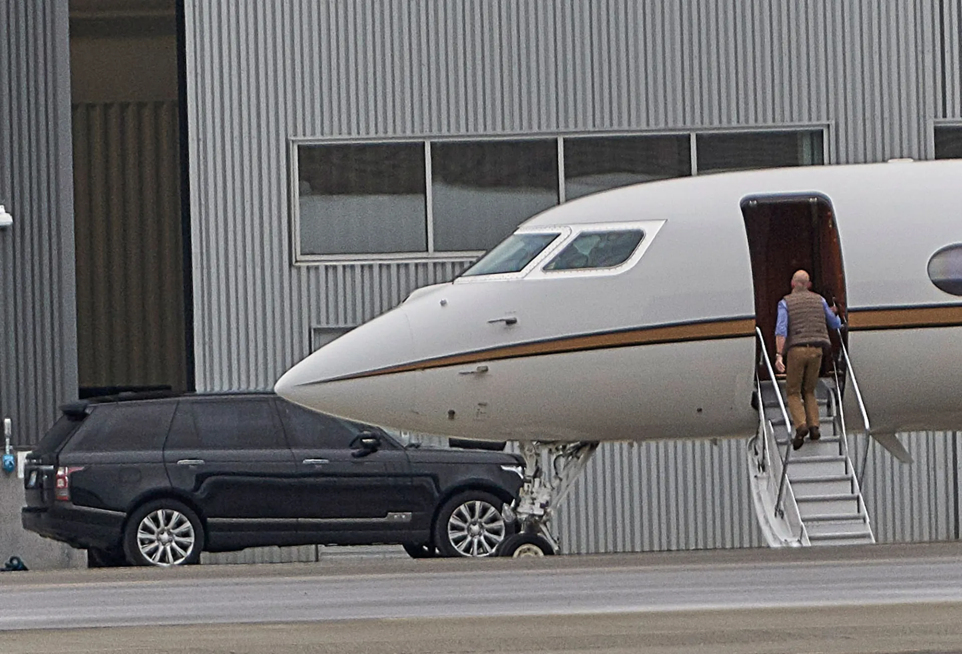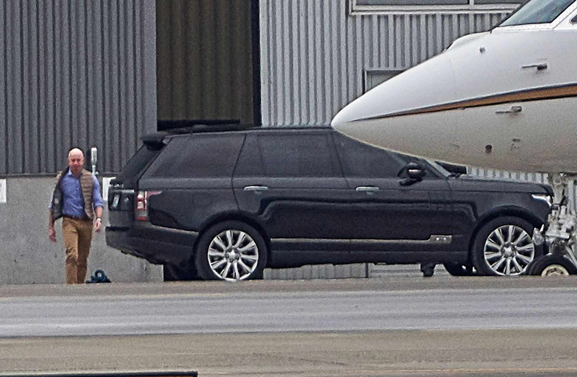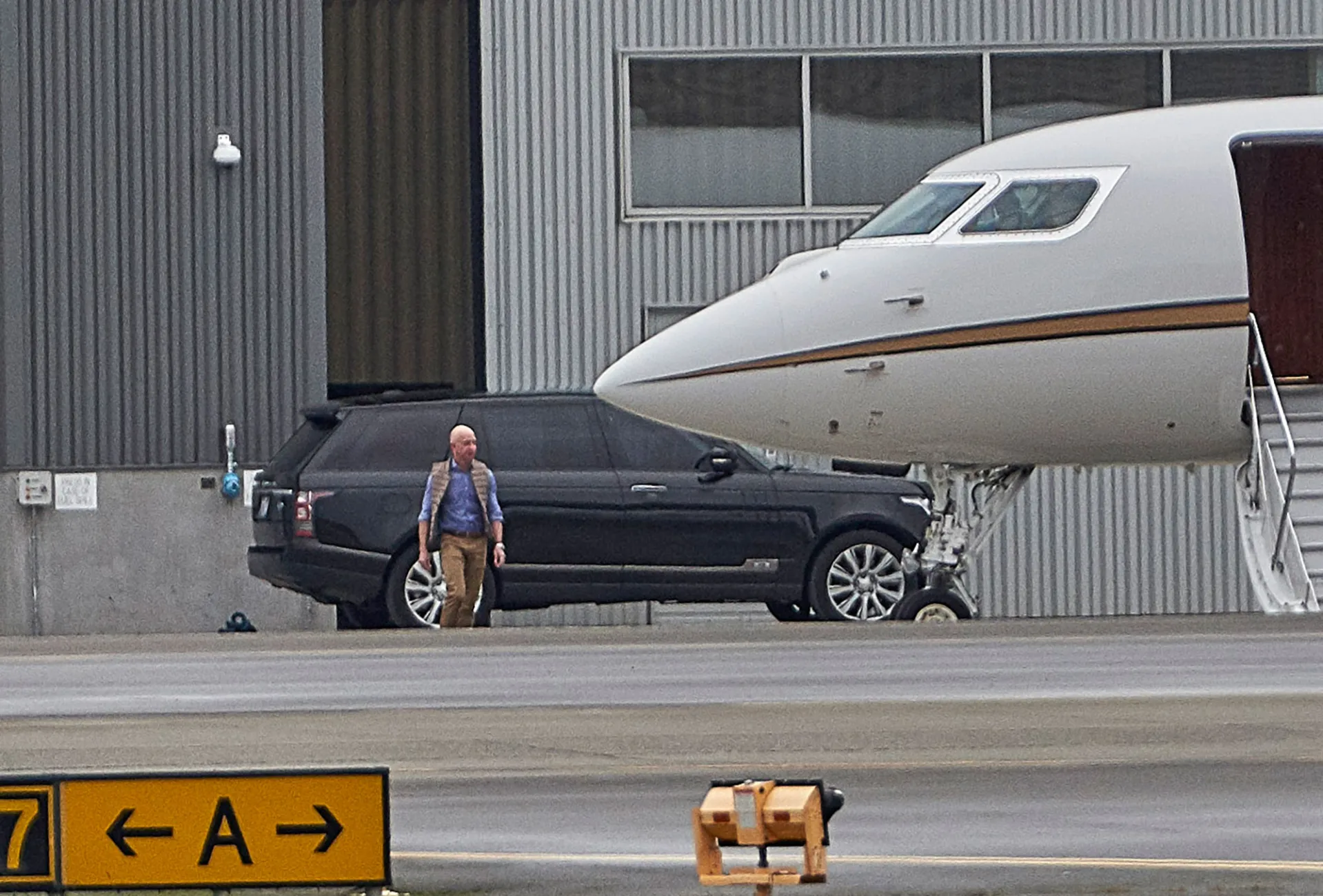 The Amazon CEO, 55, stepped out in Seattle on Friday, January 18, while boarding a private jet. He looked relaxed in an unzipped vest, a blue button-down shirt and tan khaki pants.