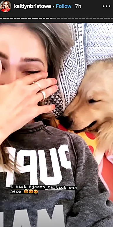 And the day just kept getting more emotional for Bristowe. The new mama shed a few tears as she bonded with Ramen, who couldn’t keep his paws off her. “He honestly hasn’t left my side since I got him,” the Dew designer said in one Instagram Story with the canine laying near her lap. “He just seems so at peace here.”