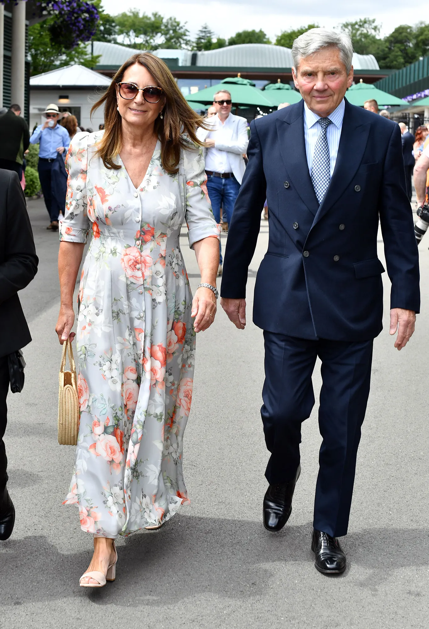 Prince William, 40, complemented his wife’s look with a grey and blue linen suit, light blue shirt and dark tie. His father-in-law, 73, wore a dark navy suit while Carole, 67, opted for a grey dress with a white and peach floral pattern and a straw purse.